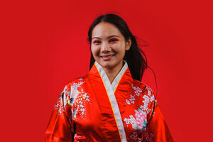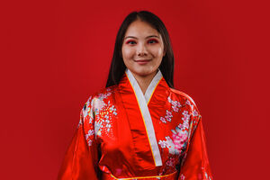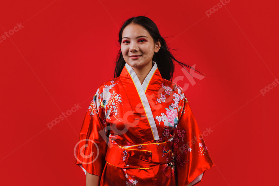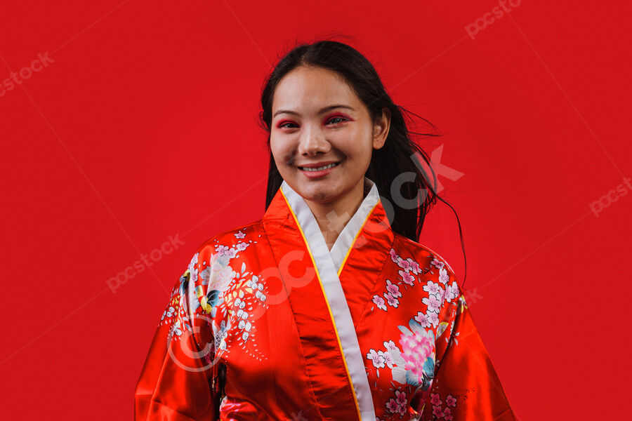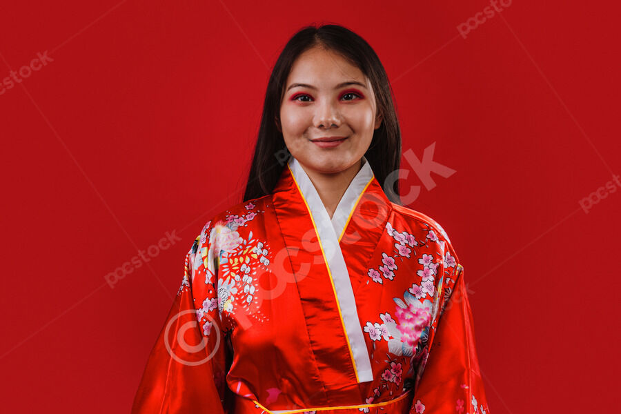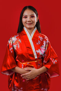 Chinese woman wearing traditional red kimono with floral patterns smiling standing against red background in studio
