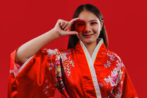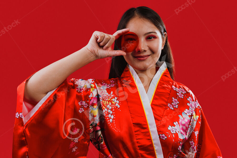Chinese woman wearing traditional red kimono with floral patterns holding round red color filter in front of her eye while standing against red background in studio