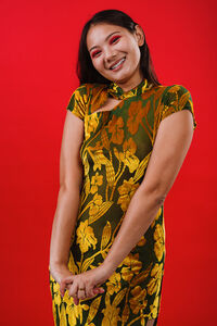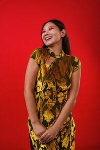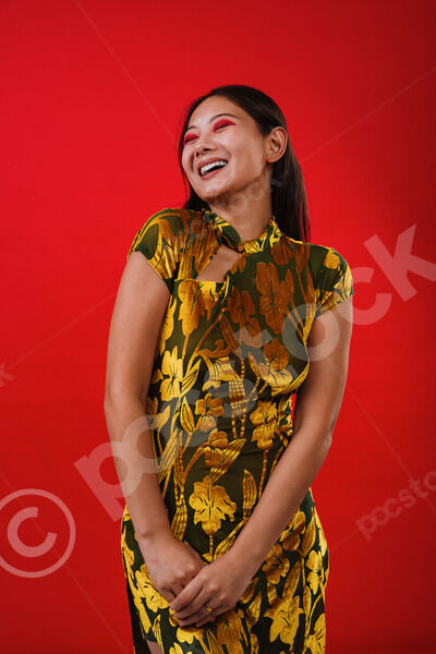 Chinese woman wearing traditional cheongsam dress holding her hands and laughing with closed eyes standing against red background in studio
