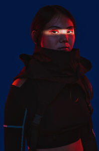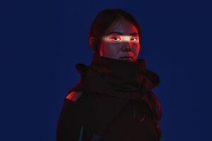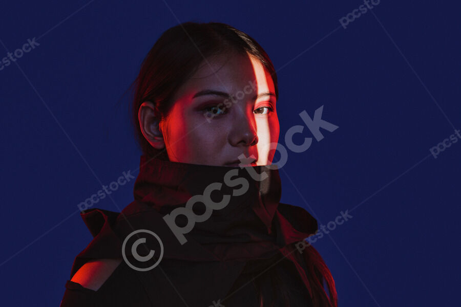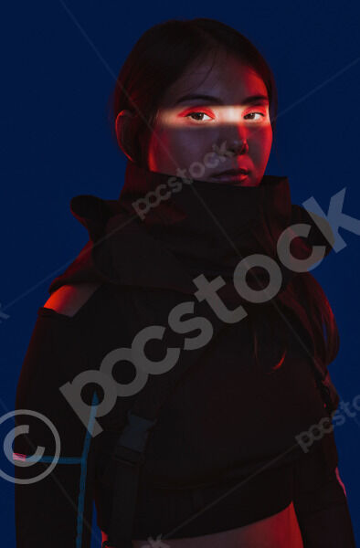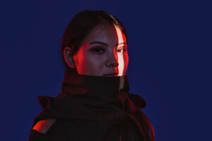 Chinese woman with face partially lit by light across her eye standing against blue background in dark studio