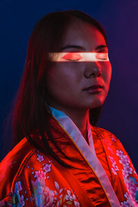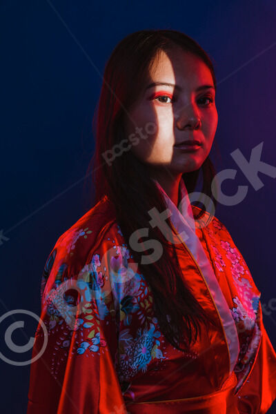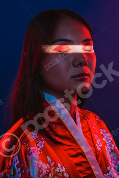 Chinese woman wearing traditional red kimono with floral patterns standing with closed eyes against blue background with light shining on her face in studio