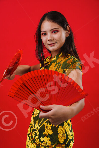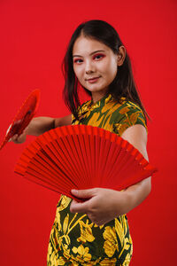 Chinese woman wearing traditional cheongsam dress holding ornate red hand fans dancing against red background in studio