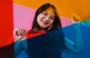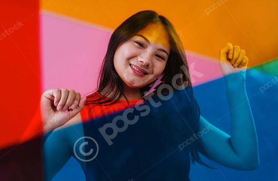 Chinese woman raising clenched fists and head tilted sideways standing behind colorful plastic sheets against pink background in studio