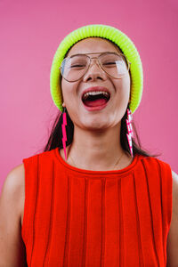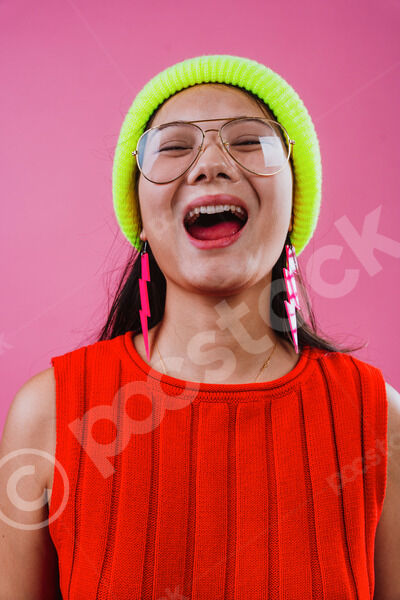 Chinese woman wearing red top, neon green beanie, and eyeglasses laughing with her mouth open standing against pink background in studio
