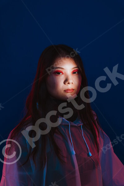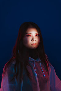 Chinese woman wearing hoodie and makeup standing in dark room against blue background in studio