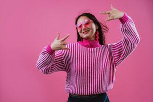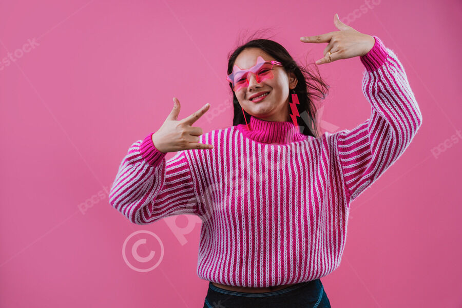 Chinese woman wearing pink striped sweater and star-shaped sunglasses making rock and roll hand gesture standing against pink background in studio