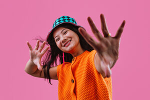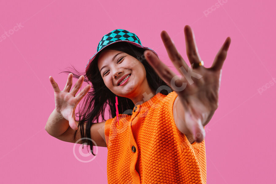 Chinese woman wearing orange knit sweater and checkered bucket hat extending her hands forward and smiling while standing against pink background in studio