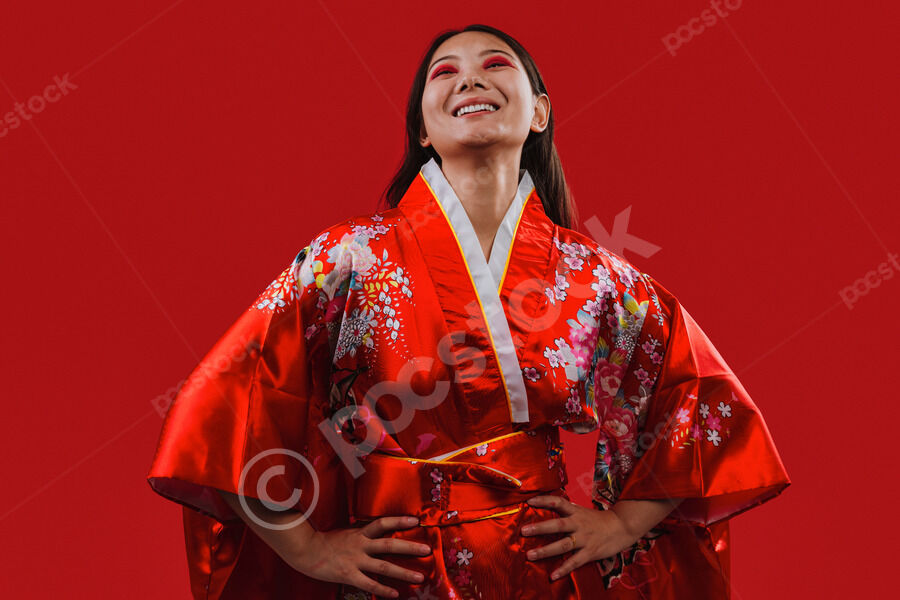 Chinese woman wearing traditional red kimono with floral patterns laughing while standing with hands on her waist against red background in studio