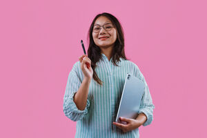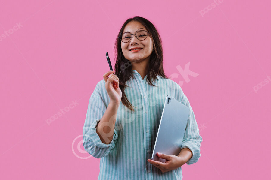 Chinese woman in striped shirt and eyeglasses holding digital pen and tablet standing against pink background in studio