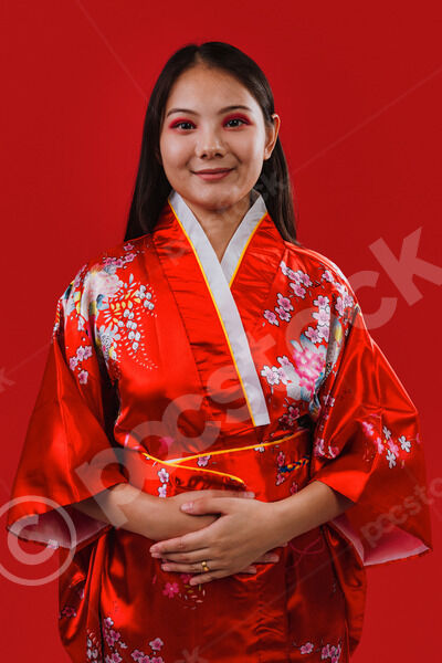 Chinese woman wearing traditional red kimono with floral patterns smiling standing with hands on her tummy against red background in studio