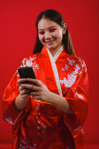 Chinese woman wearing traditional red kimono with floral patterns using smartphone and smiling while standing against red background in studio