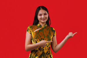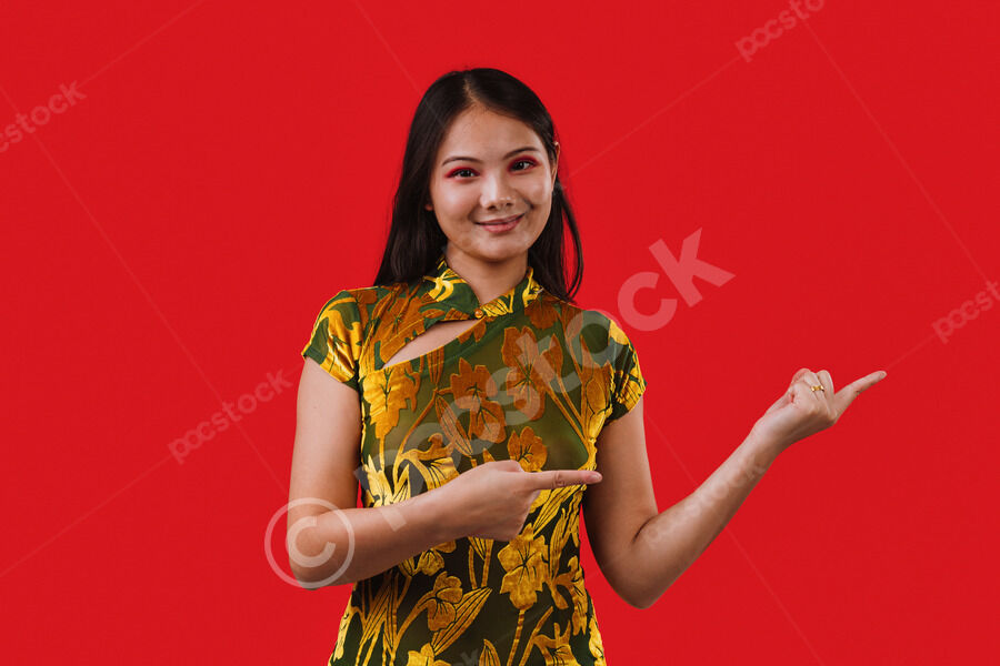 Chinese woman wearing traditional cheongsam dress pointing her fingers to the side and smiling while standing against red background in studio