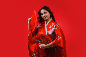 Chinese woman with flying hair wearing traditional red kimono with floral patterns smiling while standing against red background in studio
