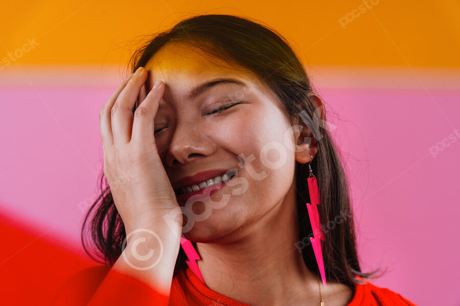 Chinese woman touching her face and smiling while standing with closed eyes behind red and orange plastic sheets against pink background in studio
