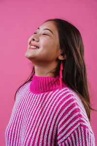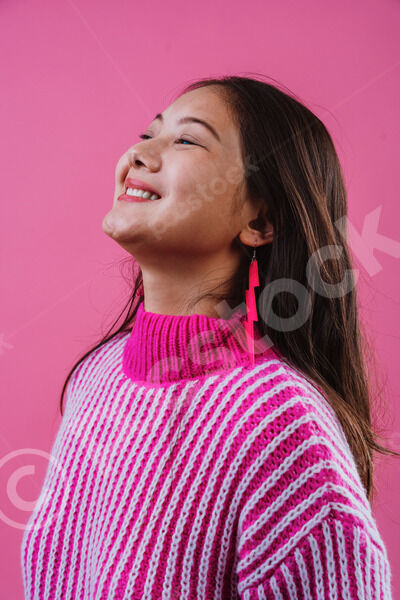 Chinese woman wearing pink striped sweater and bolt earrings smiling and looking away standing sideways against pink background in studio