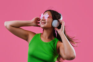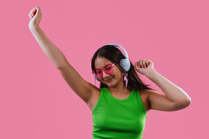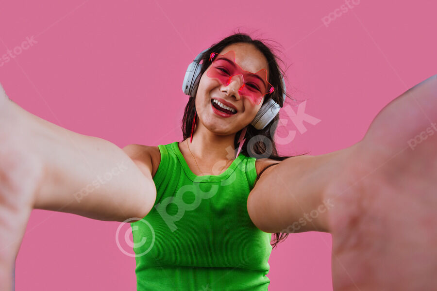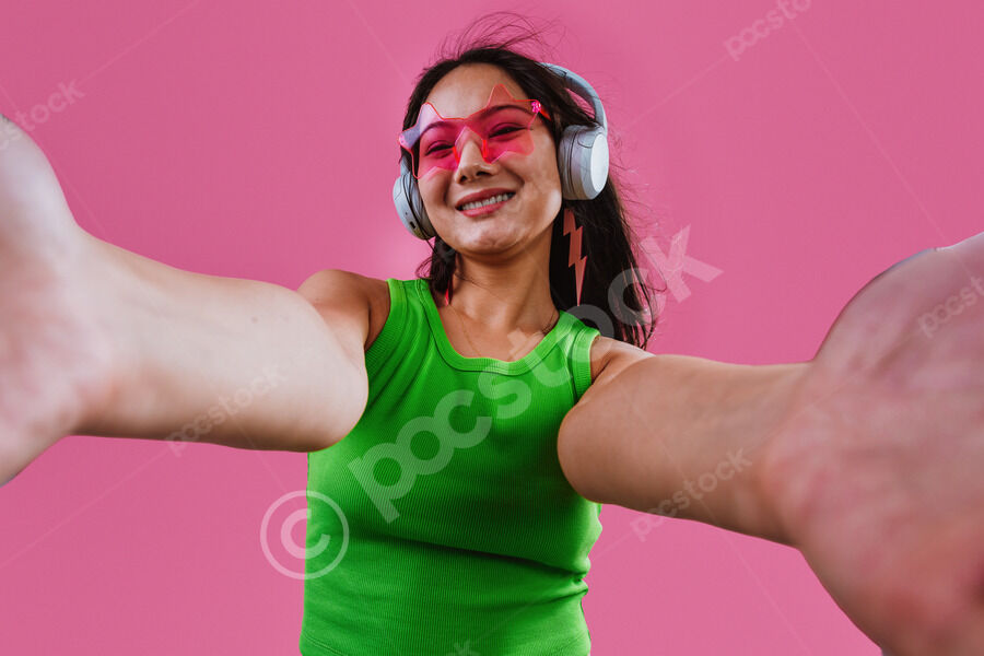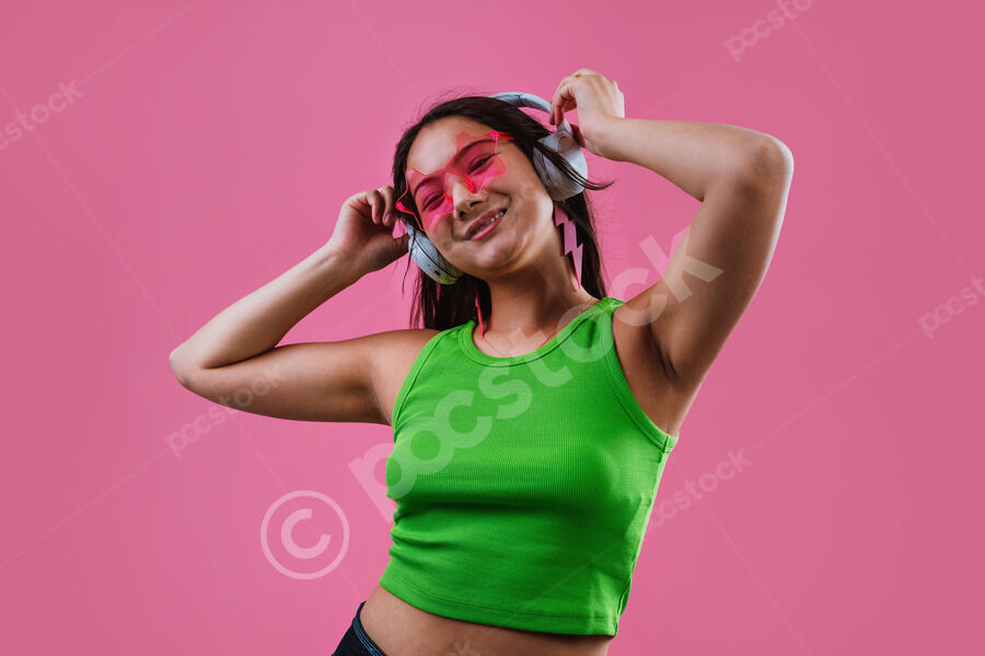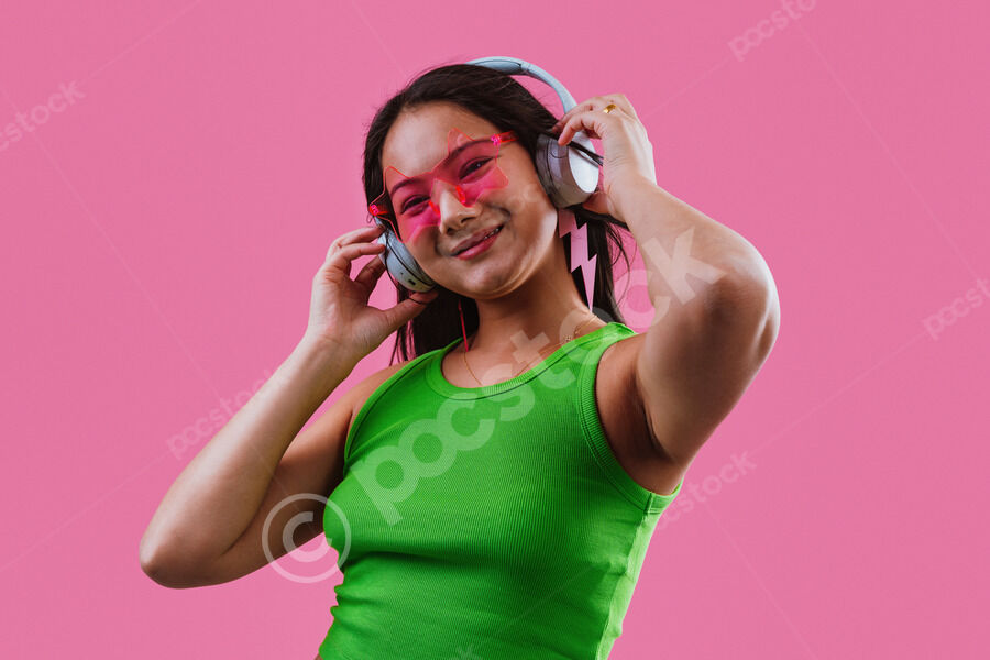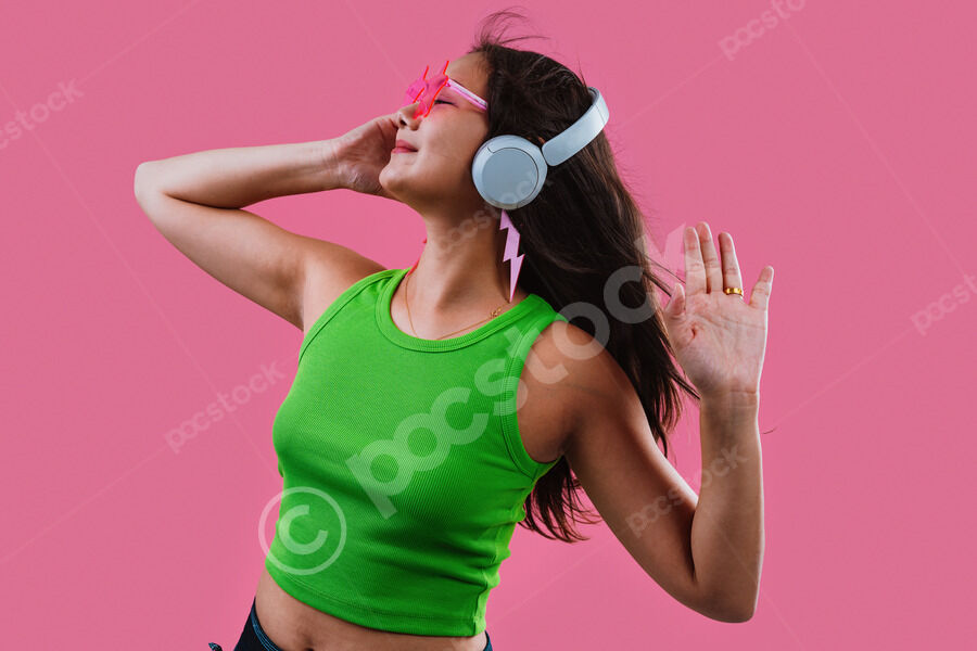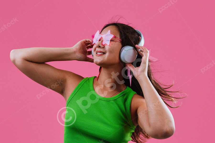 Chinese woman in green tank top and pink star-shaped sunglasses listening to music on headphones dancing against pink background in studio