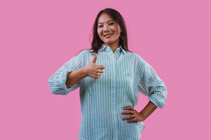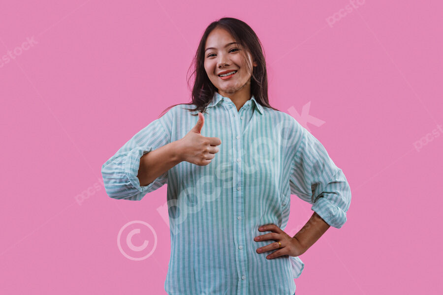 Chinese woman in striped shirt giving thumbs up and smiling standing against pink background in studio