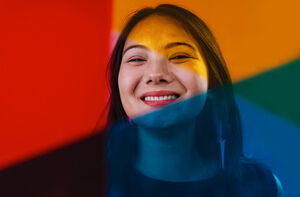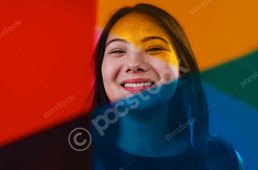 Chinese woman smiling while standing behind colorful plastic sheets against pink background in studio