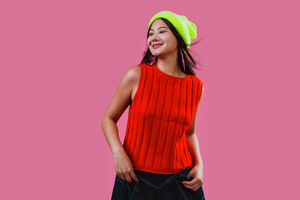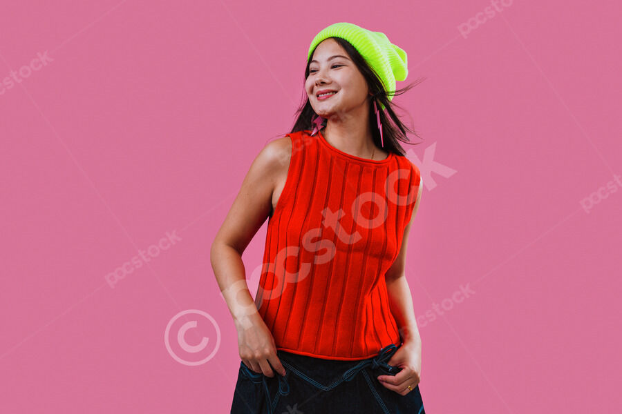 Chinese woman wearing red top, bolt earrings, and neon green beanie looking sideways and smiling while standing against pink background in studio