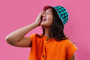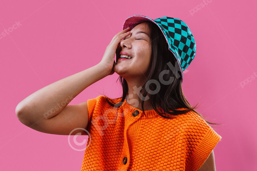 Chinese woman wearing orange knit sweater and checkered bucket hat touching her face and smiling while standing with closed eyes against pink background in studio