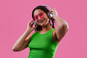 Chinese woman in green tank top, star-shaped sunglasses, and bolt earrings listening to music on headphones standing against pink background in studio