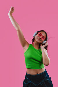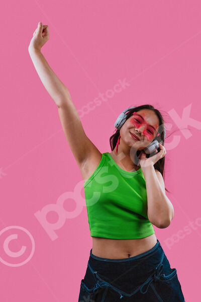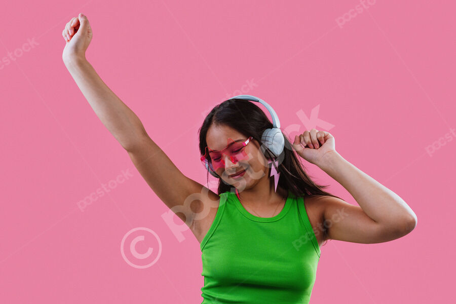 Chinese woman in green tank top and pink sunglasses listening to music on headphones dancing with raised arms against pink background in studio