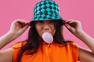 Chinese woman wearing orange knit sweater touching her checkered bucket hat and blowing bubble gum while standing against pink background in studio