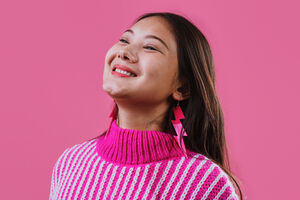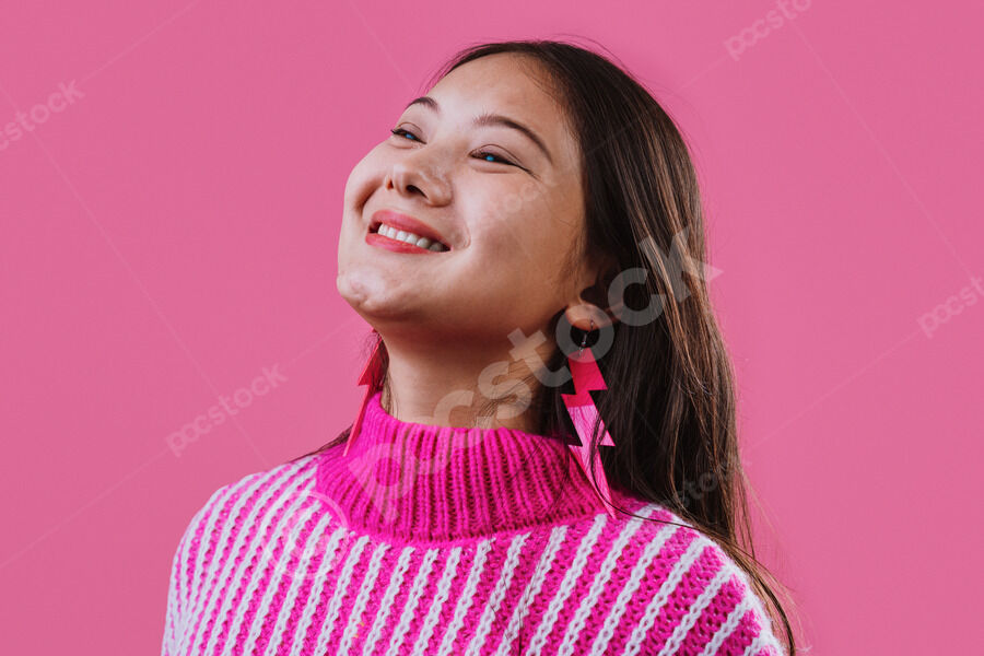 Chinese woman wearing pink striped sweater and bolt earrings smiling and looking away standing sideways against pink background in studio