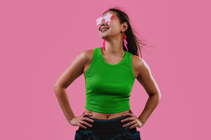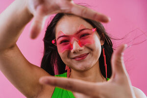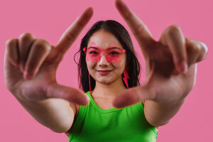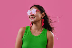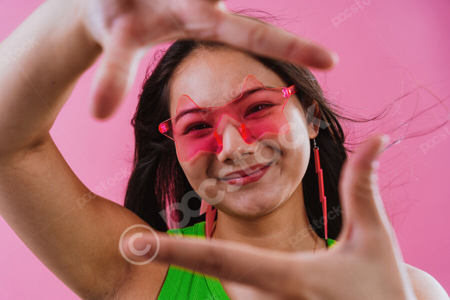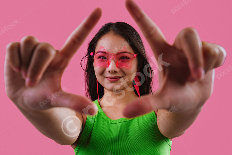 Chinese woman in green tank top and pink star-shaped sunglasses framing her face with her hands and smiling while standing against pink background in studio