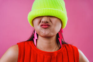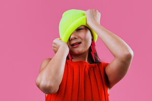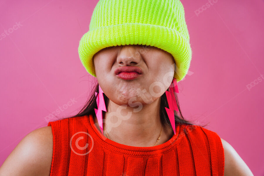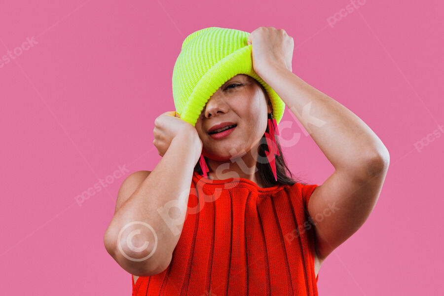 Chinese woman wearing red top and neon green beanie covering her eyes pouting her lips while standing against pink background in studio
