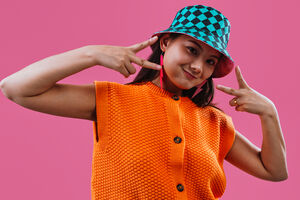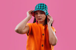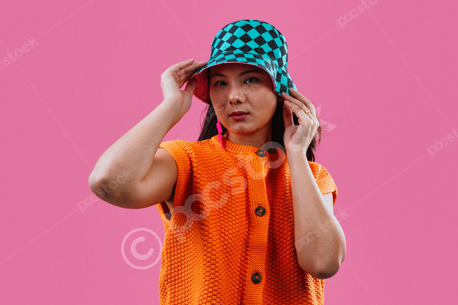 Chinese woman wearing orange knit sweater touching her checkered bucket hat standing against pink background in studio