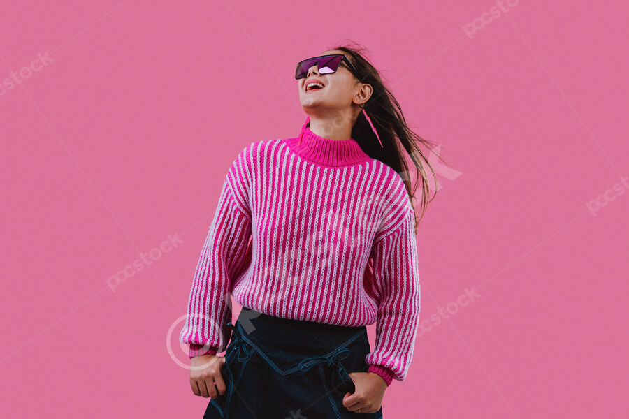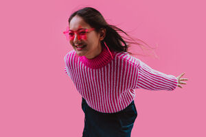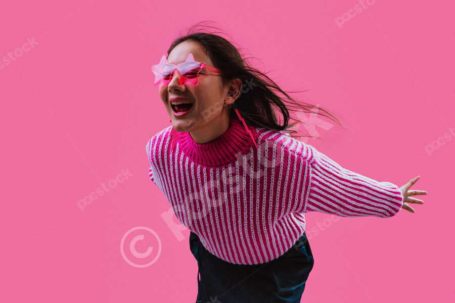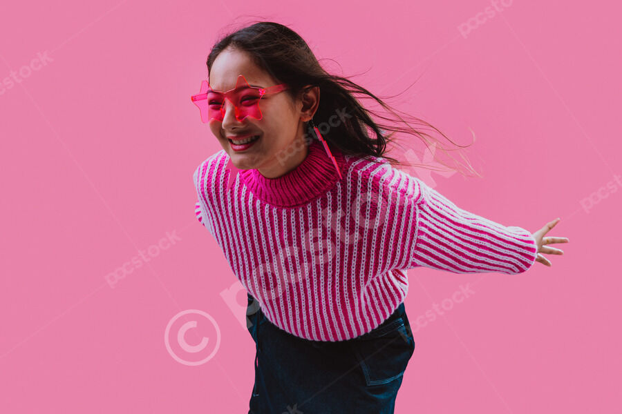 Chinese woman wearing pink striped sweater and star-shaped sunglasses having fun leaning forward and extending her hands backward standing against pink background in studio