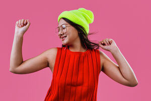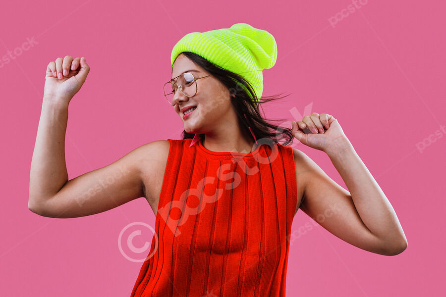 Chinese woman wearing red top, eyeglasses, and neon green beanie smiling and raising her hands while standing with closed eyes against pink background in studio