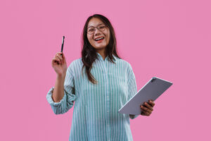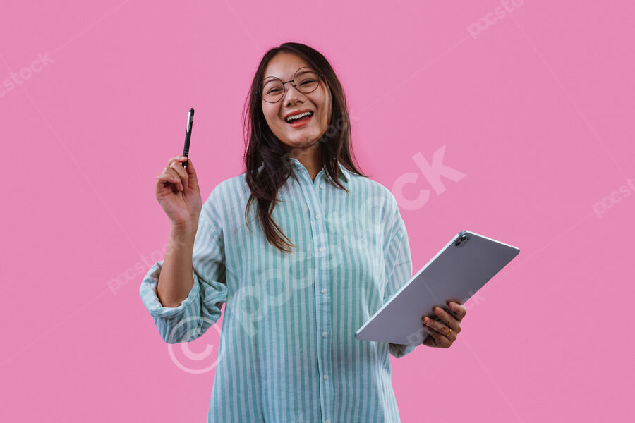 Chinese woman in striped shirt and eyeglasses holding pen and tablet laughing while standing against pink background in studio