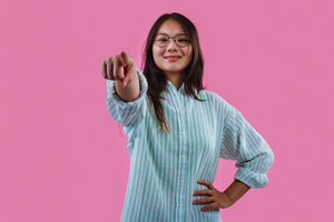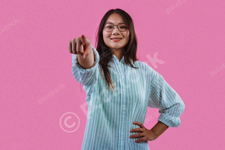 Chinese woman in striped shirt and eyeglasses pointing finger forward and smiling while standing with hand on her waist against pink background in studio