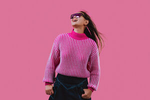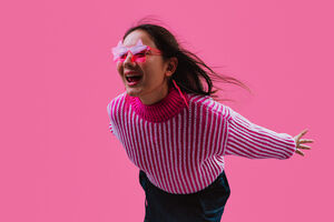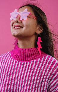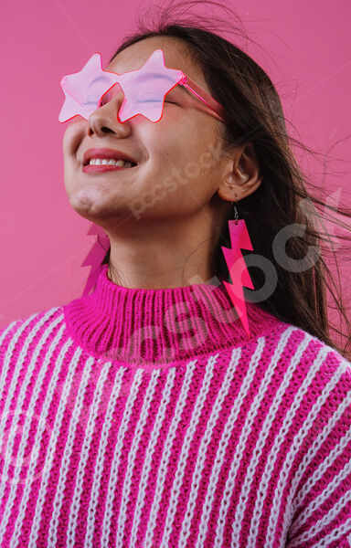 Chinese woman wearing pink striped sweater, bolt earrings, and star-shaped sunglasses smiling standing with closed eyes against pink background in studio