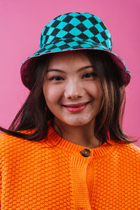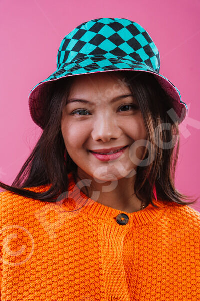 Chinese woman wearing orange knit sweater and checkered bucket hat smiling while standing against pink background in studio