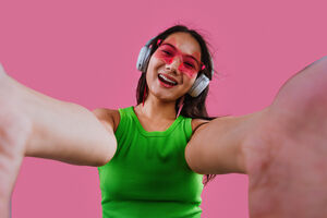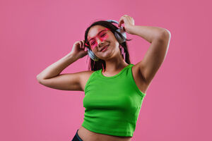 Chinese woman in green tank top, star-shaped sunglasses, and bolt earrings listening to music on headphones standing with raised hand against pink background in studio