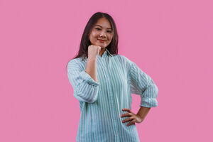 Chinese woman in striped shirt leaning her chin on her hand and smiling standing with hand on her waist against pink background in studio