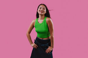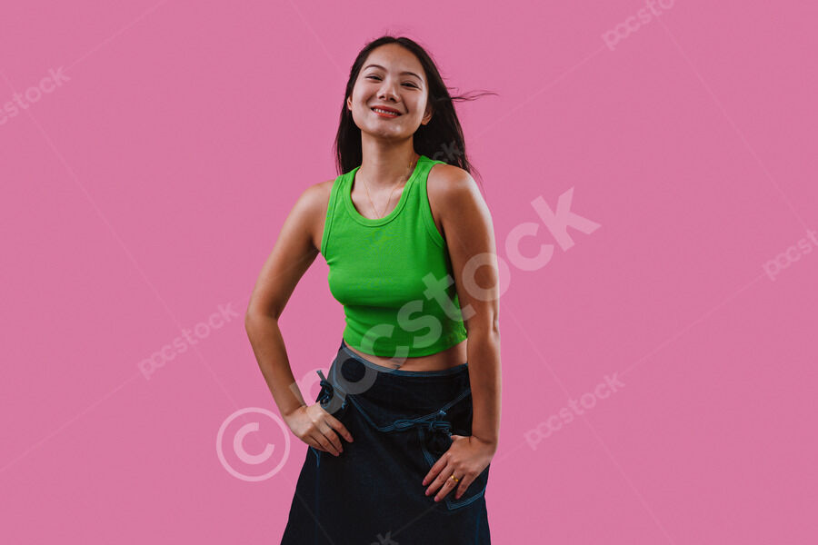 Chinese woman in green tank top smiling while standing with her thumbs in her pockets against pink background in studio