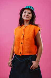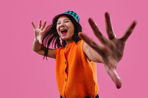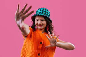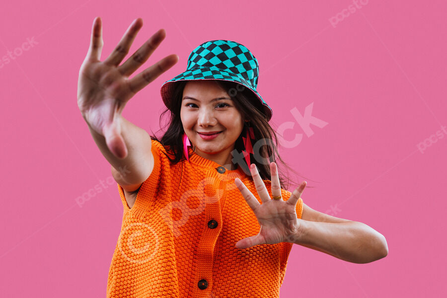 Chinese woman wearing orange knit sweater and checkered bucket hat extending her hands forward and smiling while standing against pink background in studio
