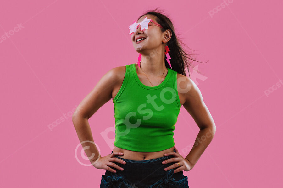 Chinese woman in green tank top, star-shaped sunglasses, and bolt earrings smiling while standing with hands on her waist against pink background in studio