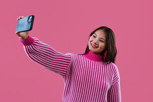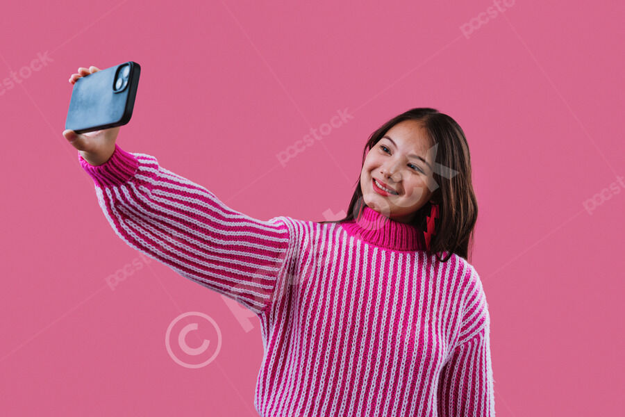 Chinese woman wearing pink striped sweater and bolt earrings taking selfie on smartphone and smiling while standing against pink background in studio
