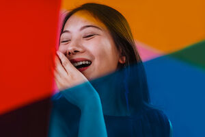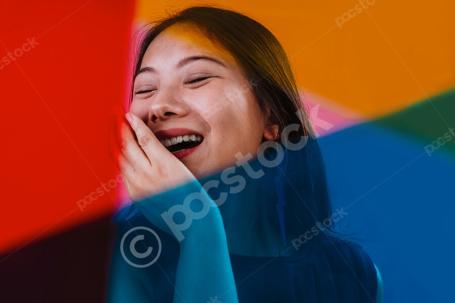 Chinese woman covering her mouth laughing while standing with closed eyes behind colorful plastic sheets against pink background in studio