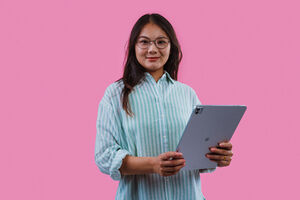 Chinese woman in striped shirt and eyeglasses holding tablet standing against pink background in studio