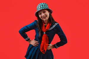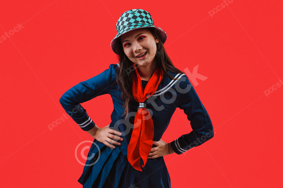 Chinese woman wearing Japanese-style school uniform and checkered bucket hat smiling standing with hands on her waist against red background in studio
