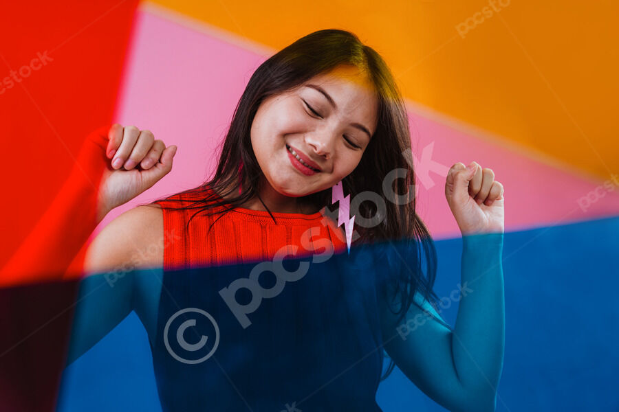 Chinese woman raising clenched fists and head tilted sideways standing with closed eyes behind colorful plastic sheets against pink background in studio