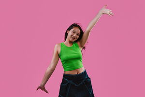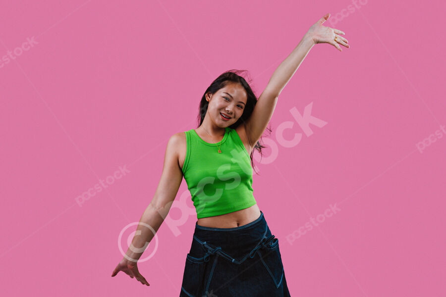 Chinese woman in green tank top raising her hands and smiling while standing against pink background in studio