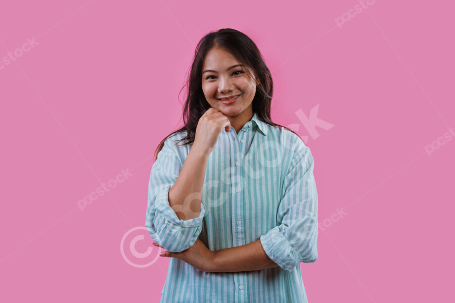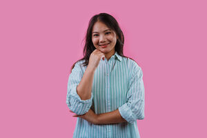 Chinese woman in striped shirt leaning her chin on her hand and smiling standing against pink background in studio