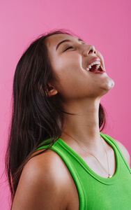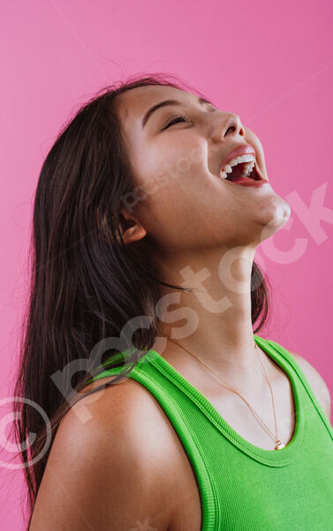 Chinese woman in green tank top laughing with her head tilted back standing against pink background in studio